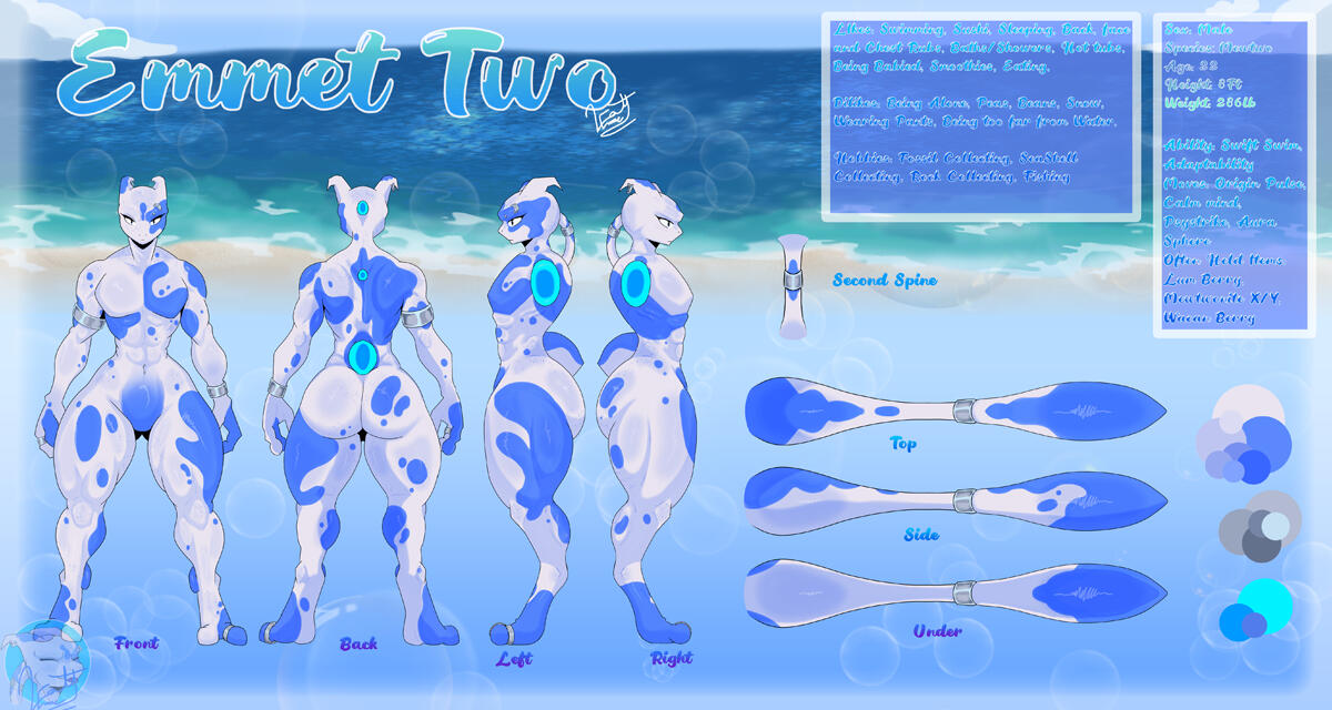 This is an example of a much higher quality ref sheet. A view of the character at each important angle to show all sides. In the case of my character, his spots are not symmetrical so both left and right sides had to be shown. there is a higher quality background, a border, Character name with custom font and gradient labels, character info. For a piece like this, would come around to 350USD depending on the amount of side details you'd desire, this information however can be discussed over email of course as not every ref sheet will need as many views as my Mewtwo.